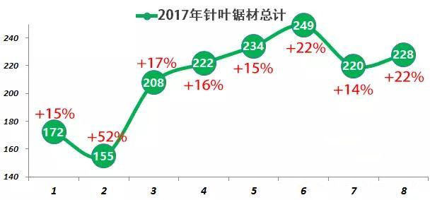 除去以上種類,其他品種的針葉、松木鋸材前8月累積進(jìn)口291萬立方米,較去年同期增長18%.