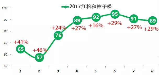 紅松樟子松1-8月累積進(jìn)口654萬立方米,較去年同期增長28%,8月份單月進(jìn)口89萬立方米,同比增長29%,但環(huán)比7月份減少2萬。
