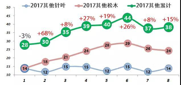 前8月累積進(jìn)口輻射松80萬立方米,花旗松17萬立方米。8月分別進(jìn)口12萬和2萬。