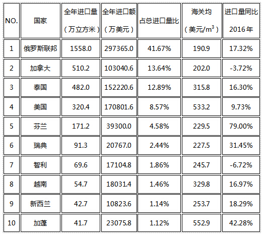其中,進口來源國排名前十的國家分別是俄羅斯聯(lián)邦1558.0萬立方米,加拿大510.2萬立方米,泰國482.0萬立方米,美國320.4萬立方米,芬蘭171.2萬立方米,瑞典91.3萬立方米,智力69.6萬立方米,越南54.7萬立方米,新西蘭42.7萬立方米,加蓬41.7萬立方米。