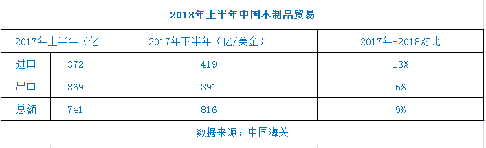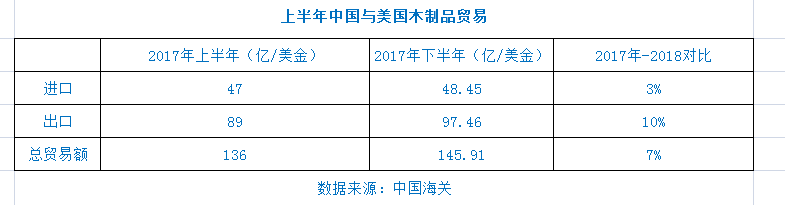 海關(guān)數(shù)據(jù)顯示,2018年上半年,中美木制品貿(mào)易額達(dá)145.91億美元,比2017年同期增長(zhǎng)7%,同比增長(zhǎng)緩慢。從美國(guó)進(jìn)口的木制品占全國(guó)進(jìn)口總量的18%,與2017年上半年持平。其中,中國(guó)對(duì)美出口額增長(zhǎng)10%,達(dá)到97.46億美元。中國(guó)從美國(guó)的進(jìn)口額僅增長(zhǎng)3%,達(dá)到48.45億美元。總體而言,美中貿(mào)易增速正在放緩。