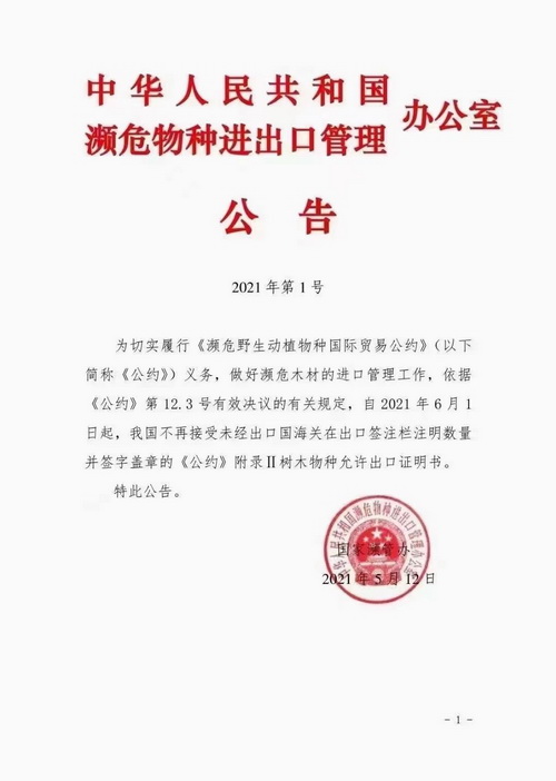 ? ? 5月12日,中華人民共和國瀕危物種進(jìn)出口管理辦公室發(fā)布2021年第1號(hào)公告,自2021年6月1日起,我國不再接受未經(jīng)出口國海關(guān)在出口簽注欄注明數(shù)量并簽字蓋章的《瀕危野生動(dòng)植物種國際貿(mào)易公約》(CITES)附錄Ⅱ樹木物種允許出口證明書。此公告一出,再次引起紅木業(yè)界的關(guān)注和熱議。