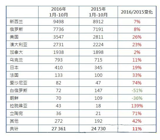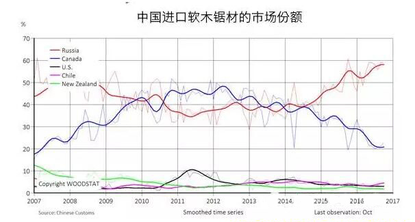 盡管10月份俄羅斯材的進(jìn)口量略有下降,但是縱觀前10個(gè)月的進(jìn)口數(shù)據(jù),俄羅斯材占據(jù)著我國(guó)整個(gè)進(jìn)口市場(chǎng)的半壁江山,份額達(dá)到56%;加拿大材緊隨其后,占24%的市場(chǎng)份額。北歐材是2016年繼俄羅斯材后的另外一個(gè)亮點(diǎn),進(jìn)口量同比漲40%,在華市場(chǎng)份額達(dá)到8%。