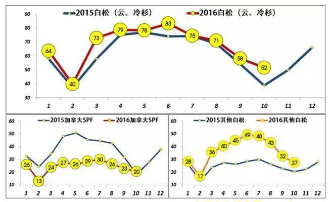 前10月白松累積進(jìn)口672萬(wàn),其中加拿大SPF木材的大幅下降18%,而俄羅斯、芬蘭、瑞典為代表的北歐云杉狂飆50%,一舉挽回白松的頹勢(shì),仍完成9%的總量增長(zhǎng)。近年歐洲白松以其較高的性價(jià)比不斷取代加拿大SPF,進(jìn)入10月以來(lái)由于俄材價(jià)格持續(xù)上漲,SPF市場(chǎng)需求量略有回升。